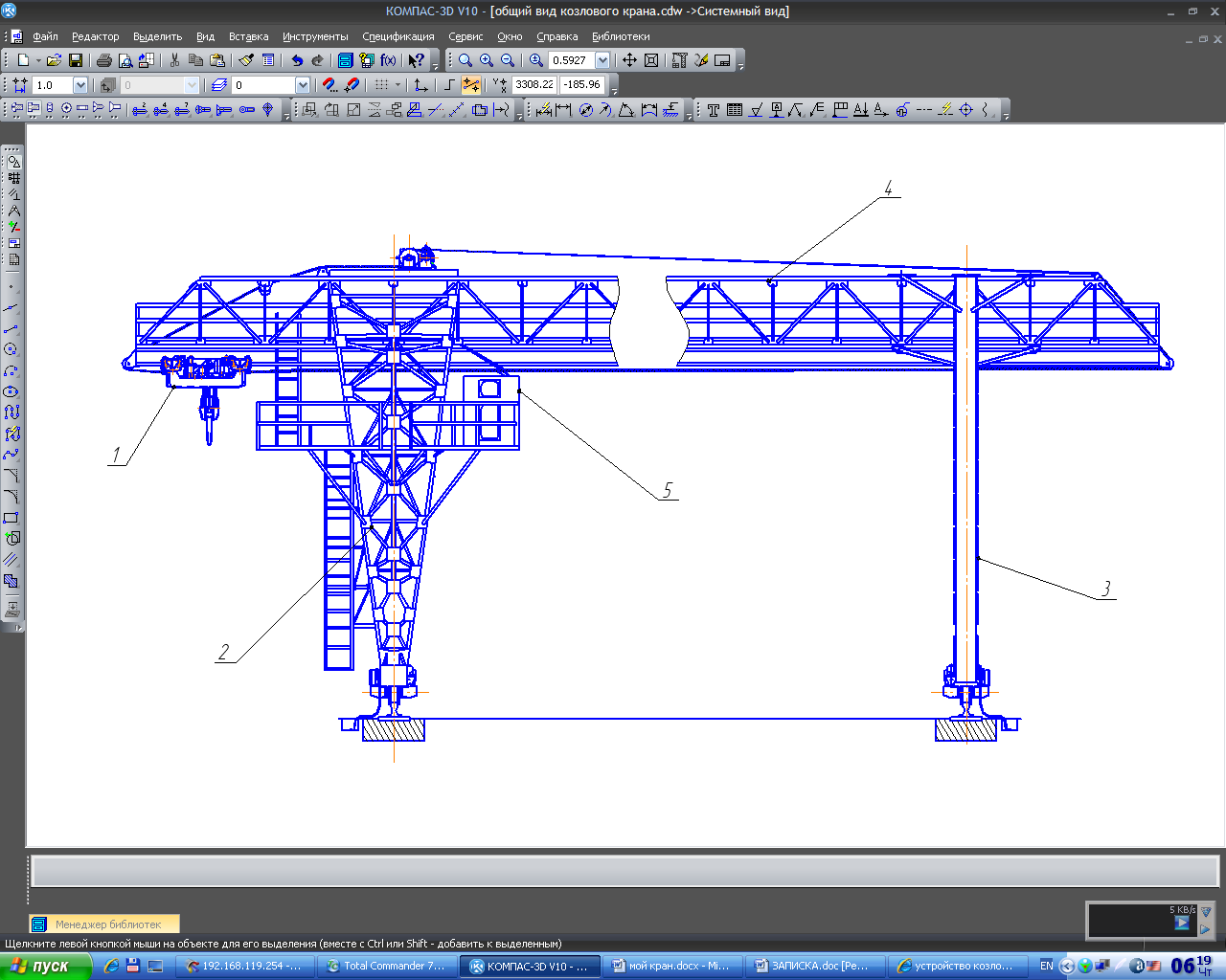 Рисунок 1- устройство козлового крана 1 – грузовая тележка; 2 – опора жесткая; 3 – опора гибкая; 4 – пролёт; 5 – кабина. Основные узлы