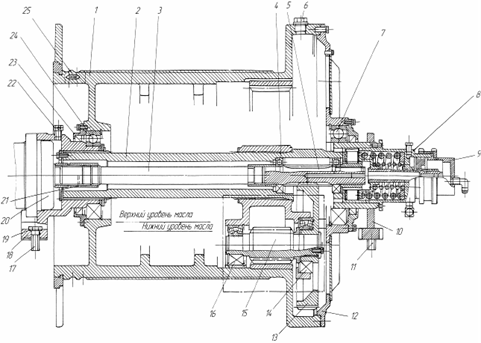 Рис. 7. Привод барабана главной лебедки. 1 – барабан; 2 – основание; 3 – вал; 4 – подшипник; 5 – вал-шестерня; 6 – пробка; 7 – подшипник; 8 – корпус; 9 – тормоз; 10 – опора; 11, 17 – болт; 12 – крышка; 13 – колесо зубчатое; 14 – подшипник; 15 – вал; 16 – подшипник; 18 – опора; 19 – шайба; 20 – гидромотор; 21 – втулка шлицевая; 22 – сапун; 23 – крышка; 24 – подшипник; 25 – клин.