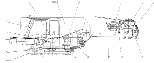 1 – опорно-поворотное устройство; 2 – гидроцилиндр подъёма стрелы; 3 – пост управления; 4 – кабина; 5 – токоприёмник кольцевой; 6 – механизм поворота; 7 – лебедка вспомогательная; 8 – лебёдка основная; 9, 11 – ролики прижимные; 10 – противовес; 12 – рама поворотная; 13 – маслоохладитель; 14 – соединение шарнирное; 15 – стопор.