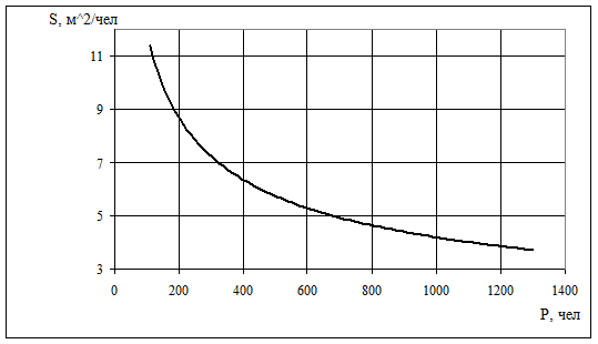 Рис. 2.1. Зависимость удельной площади S административно-бытовых помещений от числа работающих Р (по данным гипроавтотранса)