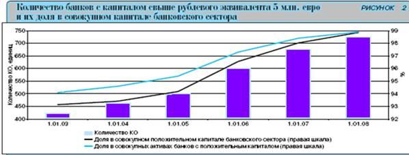 Количество кредитных организаций с капиталом свыше рублевого эквивалента 5 млн. евро за 2007 год увеличилось с 676 до 726, или на 7,4% (совокупный капитал этой группы возрос на 59,1%), а их доля в совокупном капитале банковского сектора повысилась с 98,0 до 98,9% (см. рисунок 2).