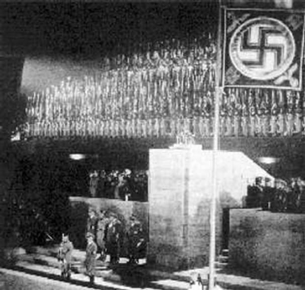 Большое представление, устроенное национал-социалистическим диктатором для фашистского дуче в Берлине на Олимпийском стадионе, 29 сентября 1937. В свете прожекторов эмблемы обоих диктаторов - свастика и менторские пучки. Между ними Муссолини, говорящий с массами. Государственный визит итальянского диктатора стал триумфальным праздником германо- итальянского братства. Ось Берлин - Рим была установлена окончательно.