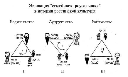 В соответствии с положением семейного треугольника можно было бы выделить три основные стадии эволюции моногамной семьи: I — патриархальная — характеризуется главенствующим экономическим и социально-психологическим положением отца как господина и кормильца чад и домочадцев, "лидера" семейной малой группы (родительство).