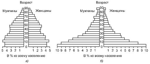 Половозрастная пирамида позволяет наглядно анализировать соотношение полов по возрастным группам населения. Строится она следующим образом. По вертикальной оси через равные промежутки откладывается возраст (в виде возрастных интервалов; например, 0-5, 5-10, 10-15 и т. д.), а по горизонтальной оси — влево — численность (или доля) мужчин, а вправо — женшин (в одинаковом масштабе). Для каждой возрастной группы строят свою линейную диаграмму и как бы «нанизывают» их друг за другом снизу вверх — от основания пирамиды до ее вершины (рис. 3). По форме такой пирамиды можно определить особенности возрастной структуры населения, выявить особенности соотношения полов в различных возрастных группах. Считанные с половозрастных пирамид количественные данные о соотношении полов и возрастных групп населения могут быть использованы для дальнейших расчетов обобщающих демографических показателей (например, коэффициентов демографической нагрузки населения), их анализа и сравнения.