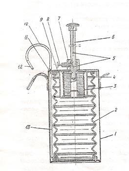 Количество вредных примесей определяют просасыванием исследуемого воздуха через индикаторную трубку воздухозаборным устройством, основной частью которого является резиновый сильфон 2. Сильфон сжимается штоком 6 между двумя фланцами: подвижным 4 и корпусом 1. Сильфон растягивается, засасывая воздух возвратной пружиной 3. Для придания сильфону жесткости на его внутренних гофрах установлены распорные кольца. Индикаторная трубка 12 соединяется с внутренним объемом сильфона 2 через отводную трубку 13.