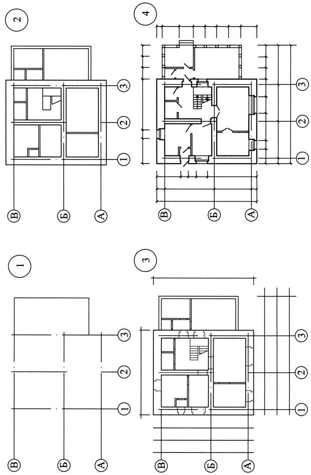 Контуры капитальных стен обводят толстой сплошной линией толщиной 0,8-1 мм. Все остальные элементы обводят тонкой сплошной линией толщиной 0,3-0,5 мм. Самые тонкие линии – размерные (тонкие сплошные 0,1-0,2 мм) и линии разбивочных осей (тонкие штрихпунктирные). Оси на всех чертежах обозначают кружком диаметром до 10 мм. Вертикальные оси слева направо маркируют цифрами, горизонтальные оси снизу вверх – большими буквами русского алфавита, исключая буквы Е, З, Й, О, Ъ, Ы, Ь.