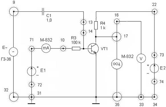 3. Поменяйте полярность источника Е1 на обратную перемычками 71-31 и 72-1). Установите самый чувствительный предел токового М-832 и убедитесь в отсутствии обратного тока при максимальном Е1. Загрубите предел мультиметра.