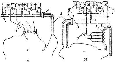 а — блочная схема; б — централизованная схема (с магистральными водоводами);