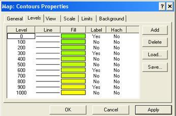 режим закрашивания карты, позволяет задавать закраски между контурами изолиний либо автоматически, по всему диапазону изолиний, либо для индивидуальных уровней.