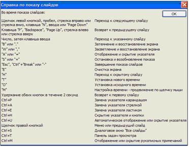 Заключительный этап работы над презентацией – просмотр её на экране. Для этого нужно перейти в режим показа слайдов. Показ начнётся с текущего слайда. Переход к следующему слайду происходит, как правило, по щелчку мыши. Порядок появления слайдов соответствует тому, как слайды «разложены» в режиме сортировщика слайдов. Скрытые слайды из этой последовательности исключаются. Нарушить данный порядок может лишь преднамеренный переход по щелчку мыши на элементе, с которым связан какой-либо слайд. Это может быть любой элемент слайда – картинка, текстовый элемент, автофигура, управляющая кнопка. При демонстрации слайдов можно использовать некоторую комбинацию клавиш. Полный список комбинаций клавиш можно увидеть, нажав F1 при показе слайдов (рис. 31).