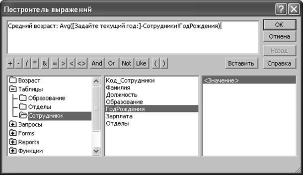 Если использовать значение поля в качестве аргумента статистической функции недостаточно (например, требуется усреднять возраст сотрудника, а в поле записан год его рождения) или требуется осуществить более сложные вычисления, следует воспользоваться Построителем выражений