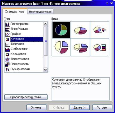 Диаграмма, построенная в автоматическом режиме может не устраивать пользователя своим оформлением. В этом случае можно для нее отдельно вызвать одно из окон мастера диаграмм (рис. Б – Е). Для этого щелкнуть правой кнопкой мыши на белом поле в углу диаграммы и из появившегося меню выбрать нужный пункт (Тип диаграммы, Параметры диаграммы, Исходные данные).
