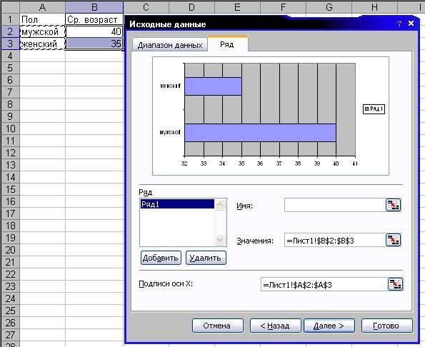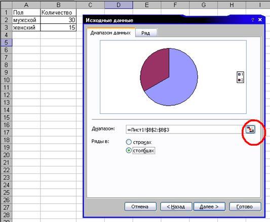 Некоторые пользователи этот этап предпочитают осуществлять по-другому – сначала выделить мышью ячейки с результатами (у нас это В2:В3), а потом вызывать Мастер диаграмм. В этом случае Диапазон