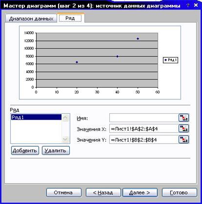 Точечная диаграмма строится аналогичным образом. Обратите внимание на заполнение окна «Исходные данные»