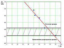 При натурных гидравлических испытаниях труб и сосудов из углеродистых сталей в работе А. Даффи, Г. Хана была установлена зависимость характера их разрушения от скорости распространения трещины; в качестве критерия распространения продольных трещин в цилиндрических сосудах давления принято номинальное окружное разрушающее напряжение s