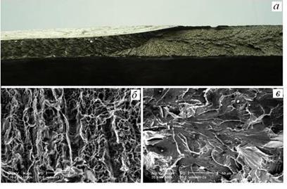 Рис. 8. Поверхность разрушения сосуда давления при распространении трещины с ветвлением, ´500: а