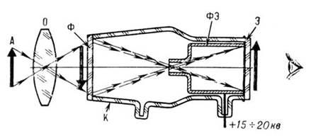 Рис. 14. Структурная схема электроннооптического преобразователя: А — объект наблюдения; О — объектив; Ф — фотокатод; Э — фокусирующий электрод; Э — люминесцентный экран; К — стеклянный или керамический корпус; стрелками показан ход лучей вне (оптических) и внутри (электронных) прибора.