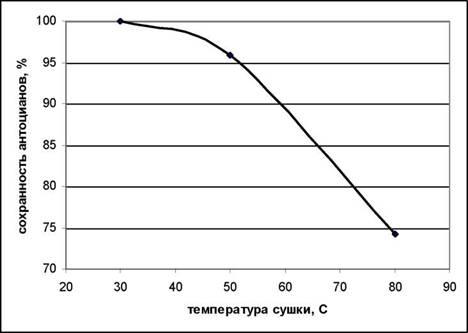 Рисунок 1. Зависимость сохранности антоцианов в высушенном сырье от температуры сушки