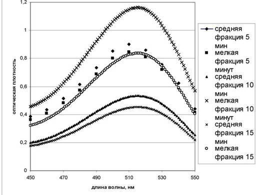 Измельчение высушенного сырья проводилось на вибрационной лабораторной мельнице МЛ1. Для определения фракционного состава сырья нами был проведен фармакопейный ситовой анализ [1] и определены размеры рабочих фракции. На гистограмме на рисунке 2 отражена зависимость процентного выхода фракций от режима измельчения - 5, 10 и 15 минут.