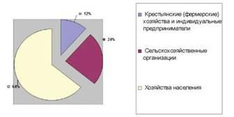 По данным рис. 2, в структуре численности крупного рогатого скота (в том числе коров) района в 2012 году доля частного подворья составляет 64%, которая превышает аналогичный показатель сельскохозяйственных организаций и крестьянских (фермерских) хозяйств и индивидуальных предпринимателей в 2,7 и 5,4 раза соответственно, несмотря, как ранее было сказано, на сокращение в хозяйствах населения численности поголовья крупного рогатого скота (в том числе коров) за данный период.