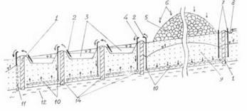 С внешней стороны завесы 1 вдоль полигона 5 отрывают водоотводную канаву 8, которую оборудуют лотками, а вдоль секций 3 сборного резервуара - водопоглощающую канаву 13 без лотков. На участке полигона с максимальным уровнем грунтовых вод (до возведения завес) оборудуют две гидронаблюдательные скважины 7, располагая их с внешней и внутренней стороны завесы 1.