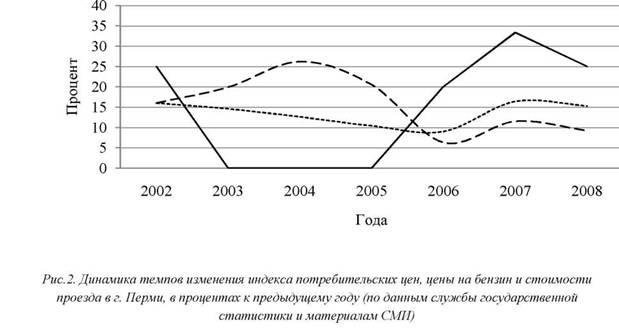 При расчете тарифа в данной методике учитываются цены на ГСМ и индекс потребительских цен. На рис. 2 отражены изменения цепных темпов роста стоимости проезда на общественном транспорте, индекса потребительских цен и стоимости бензина в Пермском крае.