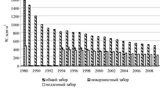 Водозабор из подземных водоносных горизонтов по 2001 г. не превышал забор воды из поверхностных водных объектов (рис. 1), а начиная с 2002 г. подземный водоотбор превосходит поверхностный. Это связано с лучшей защищенностью подземных вод от антропогенного загрязнения с одной стороны, что важно при росте водопотреб- ления на хозяйственно-питьевые нужды, и с сокращением стока весеннего половодья и перераспределением стока внутри года с другой стороны, что необходимо учитывать при заполнении искусственных водоемов.