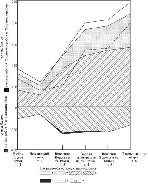 Зоны сапробности: 1 - ксеносапробная; 2 - олигосапробная; 3 - /3 -мезосапробная; 4 - а -мезосапробная; 5 - полисапробная; 6 - линия средней сапробности; 7 - номера точек наблюдения