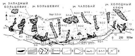 1 - выходы рудных тел на дневную поверхность или полотно карьеров; 2 - контур разведанных богатых руд (борт 3 г/т); 3 - границы блоков категорий С1 (а) и С2 (б) с утвержденными балансовыми запасами золота; 4 - границы Кызыловской рудной зоны: основной шов надвига (а), разлом Южный (б); 5 - разрывы, секущие КЗС; 6 - контур добычных карьеров; 7 - проекция пересечений по скважинам на горизонтальную плоскость, в том числе: рудных (а), безрудных (б); 8 - номер рудного тела (линзы); 9 - оси антиклиналей II порядка