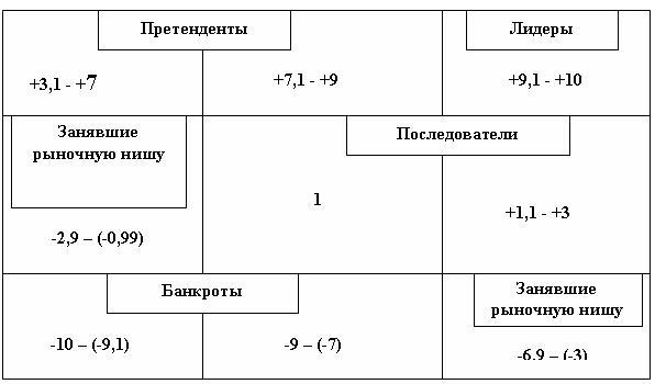Матрица представляет собой прямоугольник, разбитый на девять квадрантов (секторов), каждый из которых соответствует определенному коэффициенту от –10 до 10. Сам прямоугольник делится на пять уровней, каждый из которых соответствует определенной группе фирм, различающихся между собой уровнем конкурентоспособности и относящихся к следующим группам участников рынка: