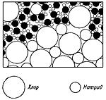 На рисунке показано трехмерное строение обычной соли (хлористого натрия). Строго говоря, кристалл состоит не из атомов, а из ионов. Ионы — это атомы с излишком или с нехваткой электронов. В кристалле соли мы находим ионы хлора (атомы хлора с лишним электроном) и ионы натрия (атомы натрия, лишенные одного электрона). Ионы в твердой соли скреплены друг с другом электрическим притяжением, но в воде некоторые из них, притянувшись к положительному водороду или отрицательному кислороду, начинают свободно двигаться. На предыдущем рисунке виден освободившийся ион хлора и другие атомы, плавающие в воде в виде ионов. На рисунке нарочно подчеркнуты некоторые детали процесса. Заметьте, например, что водородные концы молекул воды обычно обступают ион хлора, а возле иона натрия чаще оказывается кислород (ион натрия положителен, а атом кислорода в молекуле воды отрицателен, поэтому они притягиваются). Можно ли из рисунка понять, растворяется ли здесь соль в воде или же выкристаллизовывается из воды? Ясно, что нельзя; часть атомов уходит из кристалла, часть присоединяется к нему. Процесс этот динамический, подобный испарению; все зависит от того, много или мало соли в воде, в какую сторону нарушено равновесие. Под равновесным понимается такое состояние, когда количество уходящих атомов равно количеству приходящих. Если в воде почти нет соли, то больше атомов уходит в воду, чем возвращается из воды: соль растворяется. Если же «атомов соли» слишком много, то приход превышает уход, и соль выпадает в кристаллы. Мы мимоходом упомянули, что понятие молекулы вещества не совсем точно и имеет смысл только для некоторых видов веществ. Оно применимо к воде, в ней действительно три атома всегда скреплены между собой, но оно не очень подходит к твердому хлористому натрию. Хлористый натрий — это ионы хлора и натрия, образующие кубическую структуру. Нельзя естественным путем сгруппировать их в «молекулы соли».
