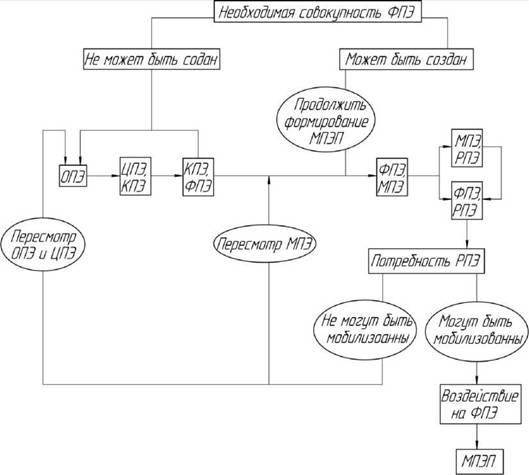 Если требуемая совокупность факторов не может быть сформирована, необходимо уточнить объект повышения эффективности и (или) цель, это означает, что формируется новая пара ОПЭ, ЦПЭ, а затем вновь пары ЦПЭ, КПЭ и КПЭ, ФПЭ. В зависимости от природы ФПЭ выбираются методы воздействия (МПЭ). В конечном итоге определяется совокупность ресурсов, потребляемых в процессе достижения цели и воздействия на объект (РПЭ). На этом этапе последовательно формируются пары МПЭ, РПЭ и ФПЭ,РПЭ. Результатом данных воздействий будет приведение объекта повышения эффективности в соответствие с поставленными целями. В случае невозможности мобилизации нужного объема ресурсов требуется или пересмотр МПЭ, или возвращение к паре ОПЭ, ЦПЭ. Цель МПЭП - оздоровление предприятий, повышение эффективности их производственной деятельности.