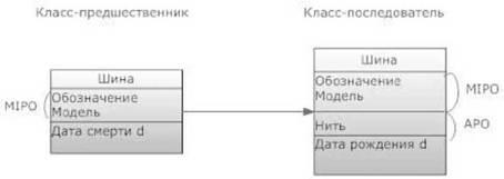 Еще 2 базовых отношения - это отношение истории и отношение взаимодействия классов и, соответственно, отношения объектов. Отношение истории определяет динамику классов при изменении параметров классов и их связей с другими классами, а также динамику объектов в тех случаях, когда одни объекты перестают существовать и заменяются другими объектами. Каждый такой класс или объект снабжается двумя параметрами: Дата рождения и Дата смерти. Рис. 2 иллюстрирует такое изменение класса Шина, связанное с введением дополнительного параметра Нить, не обязательного для всех объектов класса. При этом определяются класс-предшественник, для которого задана Дата смерти в момент изменения класса, и класс-последователь, для которого, помимо главных идентификационных параметров (MIPO) Обозначение, Модель, появляется дополнительный параметр (ADO) Нить, не обязательный для объектов этого класса, а Дата рождения измененного класса получает тоже значение, что и Дата смерти для класса-предшественника. Заметим, что в данном случае все объекты класса-предшественника не изменяются и становятся объектами класса- последователя. В общем случае может произойти между несколькими классами перераспределение параметров с добавлением новых или удалением некоторых старых. В подобном случае такое изменение классов влечет за собой изменение всех объектов этих классов.