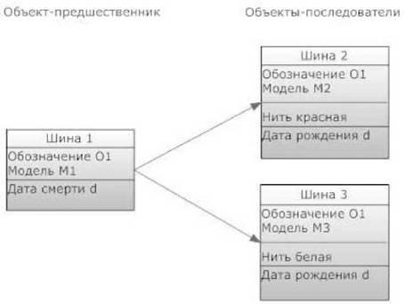 Рис. 3 иллюстрирует изменение объекта класса Шина, ставшее возможным после введение дополнительного параметра Нить. В таком случае объект Шина 1, определенный значениями идентификационных параметров О1, М1, получает значение параметра Дата смерти в момент изменения, а на смену этому объекту-предшественнику возникают 2 объекта-последователя Шина 2, Шина 3 с тем же значением параметра Обозначение, но с другими значениями параметра Модель, а также со значениями дополнительного параметра Нить. Момент рождения этих объектов-последователей определяется моментом смерти объекта-предшественника. Отметим, что в общем случае несколько объектов-предшественников могут заменяться некоторым количеством объектов-последователей. Заметим также, что если значение дополнительного параметра определить для всех объектов класса, то такой параметр можно перевести в группу обязательных главных неидентификационных параметров (MNPO) без изменения истории объектов. В этом случае при добавлении нового объекта в класс определение значения этого параметра станет обязательным (для дополнительных параметров это не так). Если же параметр перевести в группу главных идентификационных параметров, то потребуется изменение класса и всех объектов, что также потребует отношения истории.