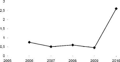 Лабораторный контроль за загрязнением атмосферного воздуха в 2006-2010 годах проводился Республиканским аккредитованным испытательным лабораторным центром ФГУЗ «Центр гигиены и эпидемиологии Республики Калмыкия». В 2010 году из исследованных 374 проб атмосферного воздуха 2,6 % не отвечало гигиеническим нормативам по критериям безопасности для здоровья населения (рис. 1). Из данных рис. 1 следует, что процент проб атмосферного воздуха, не отвечающих гигиеническим нормативам по критериям безопасности для здоровья населения, в 2010 году увеличился в 3,7 раз по сравнению с 2006 годом.