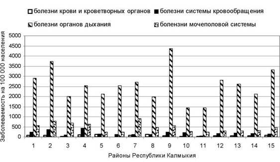 Рис. 2. Заболеваемость населения в районах Республики Калмыкия 1 - всего по Республике Калмыкия, 2 - г. Элиста, 3 - Городовиковский, 4 - Ики-Бурульский, 5 - Кетченеровский, 6 - Лаганский, 7 - Малобербетовский, 8 - Октябрьский, 9 - Приютненский, 10 - Сарпинский, 11 - Целинный, 12 - Черноземельский, 13 - Юстинский, 14 - Яшалтинский, 15 - Яшкульский