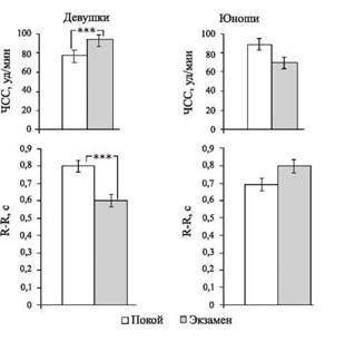 Рис. 1. Изменение частоты сердечных сокращений и длительности интервалов R-R у студентов разного пола во время экзамена (*** — р< 0,001; парный t-тест)