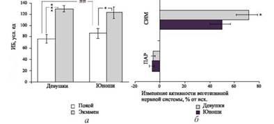 Отражением гендерных особенностей функционирования этих механизмов служат существенные различия в величинах ИБ, которые проявлялись между девушками и юношами даже в исходном состоянии. Так, на фоне психического покоя наименьшие значения ИБ отмечались у девушек и составляли в среднем 76 ± 8,27 усл. ед. У юношей ИБ был на 13,1 % достоверно выше, чем у девушек. Во время экзамена у представителей обеих гендерных групп ИБ резко увеличивался, хотя у девушек это увеличение оказалось на 25,3 % больше, чем у юношей (рис. 2, а).