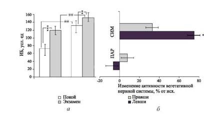 На основании проведенных наблюдений можно утверждать, что характер вегетативной регуляции кардиоритма у студентов как в покое, так и во время эмоционального стресса в определенной мере детерминируется типом ФМА. В пользу такого заключения свидетельствуют также результаты анализа показателей активности симпатической и парасимпатической систем (рис. 4, б). В частности, для правополушарных испытуемых (левшей) во время экзамена было отмечено повышение индекса СИМ на 75,0 % (р < 0,05) с одновременным снижением показателя ПАР на 7,1 %. Что касается левополушарных студентов (правшей), то у них умственное напряжение на фоне экзаменационного стресса вызывало активацию обоих отделов вегетативной нервной системы. При этом индекс СИМ достоверно увеличивался на 37,5 %, тогда как прирост ПАР составил 15,4 %.