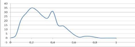 Важным параметром, характеризующим задания тестового комплекса, является параметр трудности вопросов, определяемый по доле студентов, не сумевших ответить правильно. На графике распределения вопросов комплекса по трудности (рис. 1) мы видим, что смещение кривой преобладает в сторону легких вопросов. По результатам анализа средняя трудность вопросов оказалась невысокой (0,28), приблизительно 1/3 вопросов (около 80-ти вопросов из 250) занижена по степени трудности для исследуемого контингента студентов. Соответственно исследуемый комплекс не обладает достаточно широким и равномерным распределением заданий по параметру трудности.