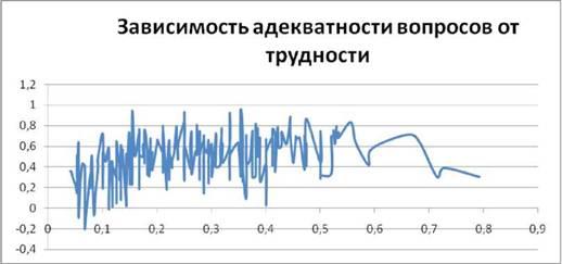 Рис. 3. Зависимость адекватности вопросов тестового комплекса по выявлению теоретических знаний от их трудности