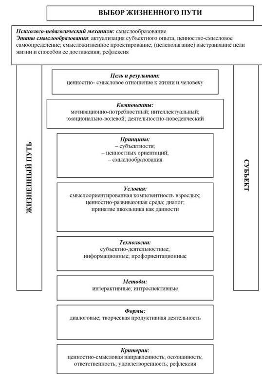 Выбор жизненного пути в педагогическом аспекте понимается нами как социально-педагогический феномен, задающий индивидуальный способ достижения жизненных целей в соответствии с моральными ценностями. Этот выбор, делаемый в юношеском возрасте, не сводится к выбору профессии или вариантов жизненного пути, это непрерывный творческий процесс преобразования смыслов и решения жизненных задач.