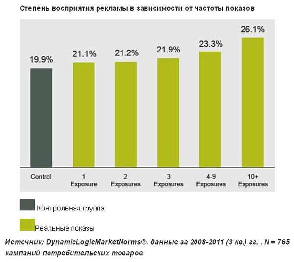Очень заманчиво начать вносить изменения уже через несколько дней после запуска кампании, чтобы повысить отдачу от оптимизации и сократить потери. Но эффект воздействия кампании на бренд проявляется не сразу. Частота показов является одним из важнейших факторов эффективности кампании. Сравнение степени восприятия кампаний в сегменте потребительских товаров показывает динамику воздействия от первого показа до количества показов более 10.