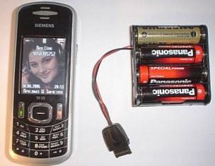 А это наша старая знакомая, пальчиковая батарейка. Правда, теперь она в компании своих сестер. Четыре батарейки АА помещаются в коробочку и через переходник заряжают мобильный телефон на 60-100 % в зависимости от емкости родного аккумулятора.