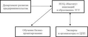 Содержание программы определяла ставка на активные формы обучения проектированию, что обусловило привлечение субъектов предпринимательства для обсуждения содержания разрабатываемых в программе проектов. В качестве экспертов привлекались и отдельные представители Департамента предпринимательства, муниципальных органов власти (рис.1).