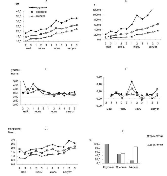 Динамика исследованных морфофизиологических показателей в трех размерно-весовых группах существенно отличается, темп линейного роста и весового роста товарной рыбы во многом определяется навеской рыбы при зарыблении (рис., А, Б).