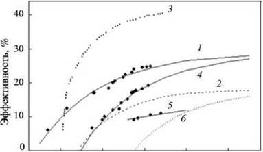 Графики построены на основании опубликованных материалов и доклада Д. Ка- хена. Из рисунка 1 видно, что наибольшие значения КПД солнечных фотоэлементов были достигнуты для систем на основе материалов AIIIBV, в то время как для остальных полупроводников КПД в настоящее время не превышает 20-25%.