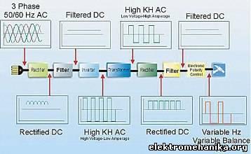 Переменный ток от потребительской сети, частотой 50 Гц, поступает на выпрямитель. Выпрямленный ток сглаживается фильтром, затем полученный постоянный ток преобразуется инвертором с помощью специальных транзисторов с очень большой частотой коммутаций в переменный, но уже высокой частоты 20-50 кГц. Затем переменное напряжение высокой частоты понижается до 70-90 В, а сила тока соответственно повышается до необходимых для сварки 100-200 А. Высокая частота является основным техническим решением, которое позволяет добиться колоссальных преимуществ сварочного инвертора, если сравнивать с другими источниками питания сварочной дуги.