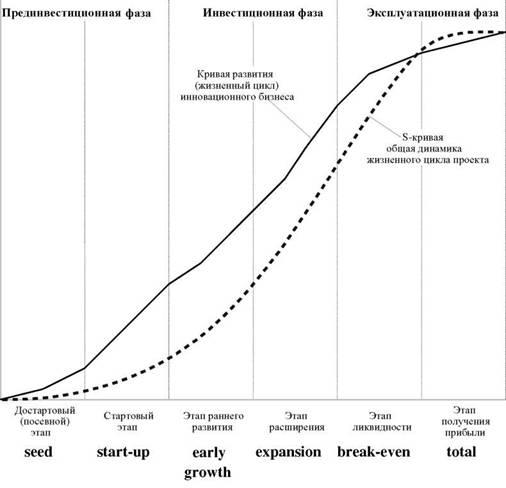 Общесистемные основы возможности и эффективности применения управления проектами к инновационной деятельности заложены в единстве жизненного цикла проекта, продукта и инновационной организации. До последнего времени эти три модели рассматривались изолированно друг от друга, так как давали представление об одном и том же явлении, но с различных точек зрения, свойственных различным участникам инновационного проекта [5]. Сегодня многими теоретиками и практиками осознается принципиальное единство этих трех аспектов жизненного цикла одного и того же явления [4]. Так, на рис. представлена модель жизненного цикла инновационного (венчурного) предприятия совместно с так называемой S-кривой жизненного цикла проекта, которая показывает изменение самых различных показателей проекта нарастающим итогом. Как видим, развитие инновационного предприятия также можно рассматривать как проект (инновационный и инвестиционный одновременно).