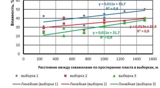 Наблюдается некоторое уменьшение влажности по падению пласта: 1-я выборка — 41,3 % (31...50 %), 2-я выборка — 36,6 % (24...40 %), 3-я выборка — 30,2 % (20...39 %) (рис. 3).